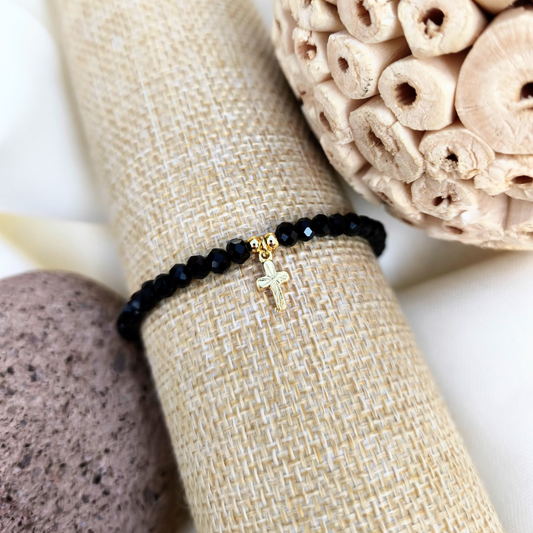 Pulsera con cristales negros y cruz bañada en oro 24k