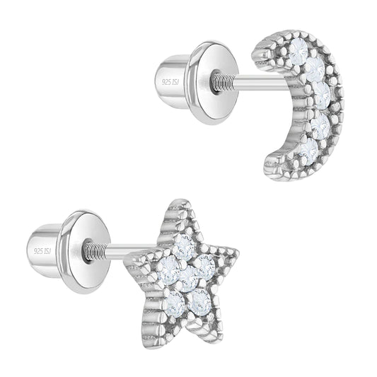 Aros mágicos de estrella y luna de plata 925 con circones para niñas y adolescentes