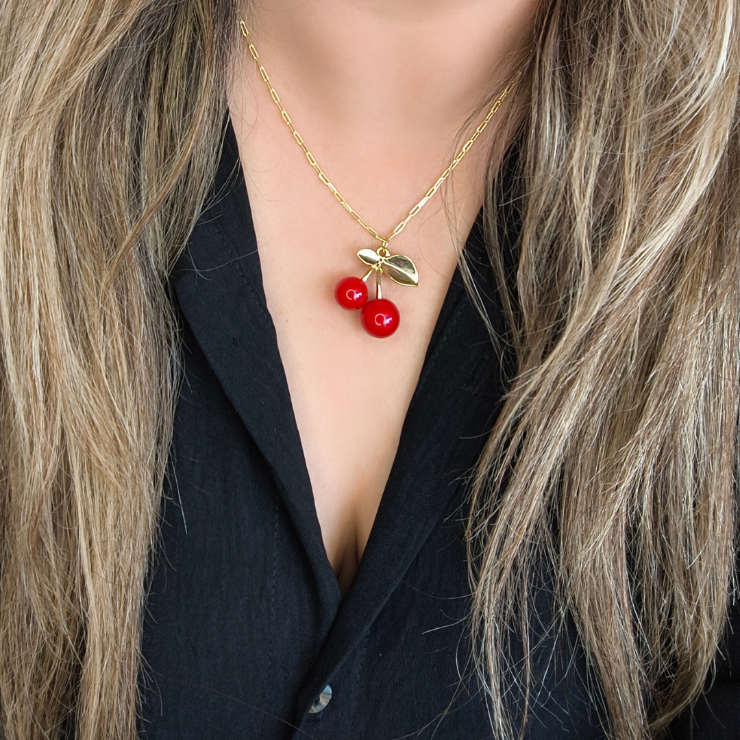 Este collar de 45 cm de largo, bañado en oro de 24 kilates, es el toque perfecto de dulzura y estilo para tu look diario. Su dije de cereza, delicado y con personalidad, evoca frescura, alegría y feminidad, convirtiéndose en el detalle ideal para destacar con un accesorio único.